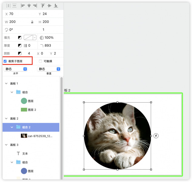 1、我们首先绘制一个形状或者插入一张图片,再使用Control+g为该图层编组。点击编组,而不是编组内的元素,为该组在右侧检查器面板选中“裁剪子图层”,还可以设置长宽、圆角来改变蒙版。